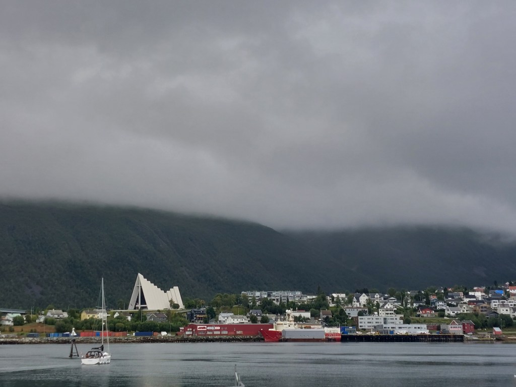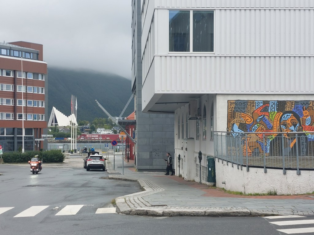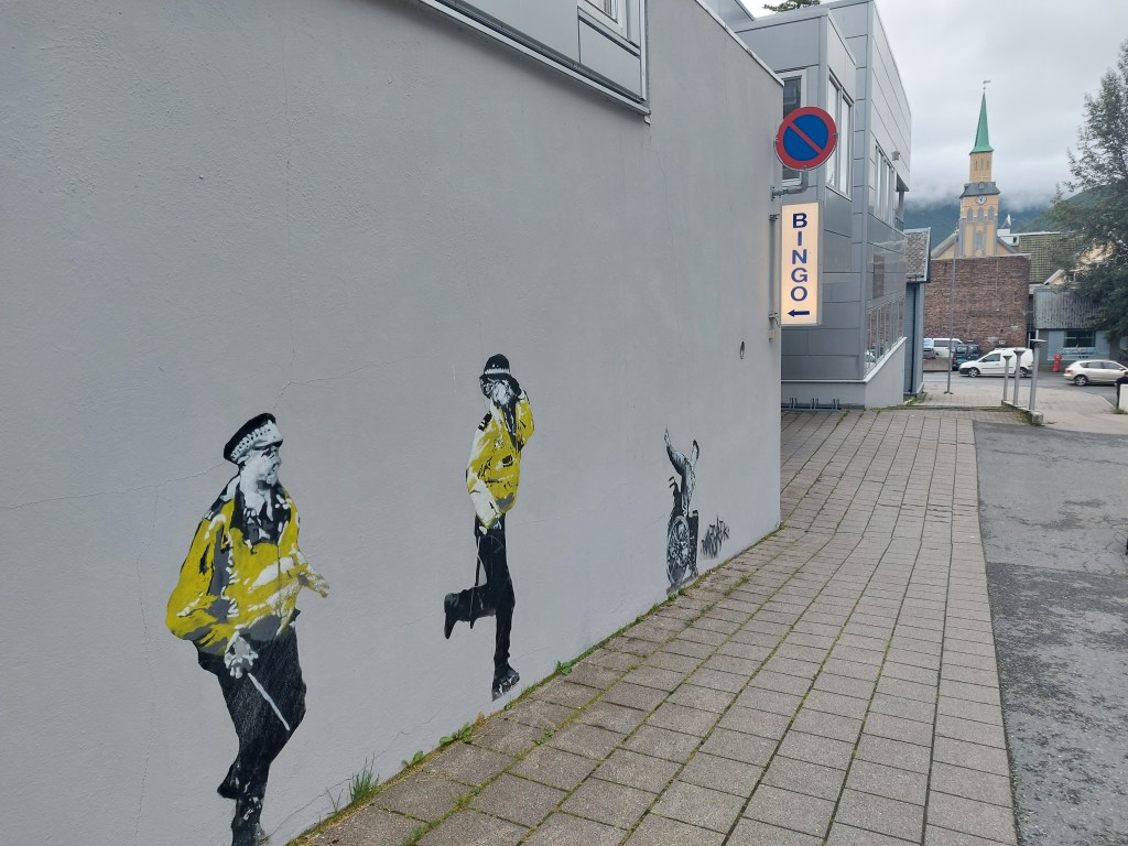 Nicht nur nehme ich ein wohlverdientes Bad in der Menge, bei dem ich auch den ersten Flohmarkt Norwegens sehe. Meine Schritte führen mich an einem Banksy-artigen Kunstwerk hinunter zum Kai, wo ich der Eismeerkathedrale ehrfürchtig ansichtig werde.