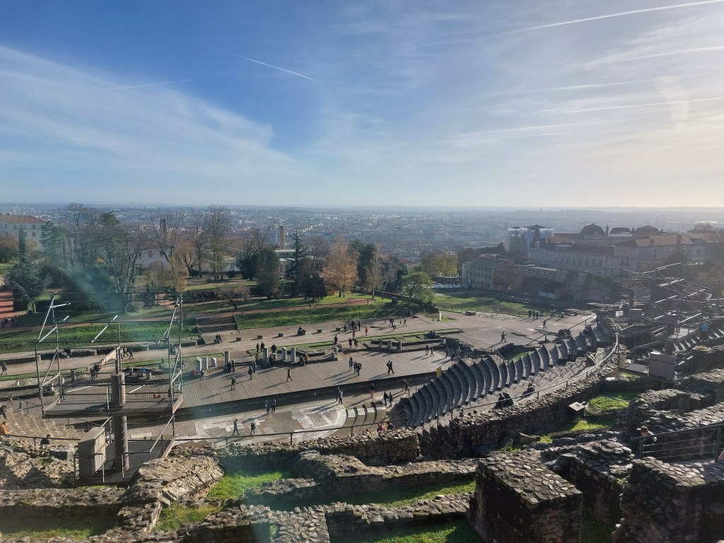 Eine weit frühere Traumfabrik findet sich auf der anderen Seite der Stadt: die römischen Theater. Sie liegen auf einer Anhöhe und bieten einen unglaublichen An- und Ausblick. Bis zu 10000 Menschen waren hier ab dem ersten Jahrhundert nach Christus versammelt, um Tragödien und Komödien zu konsumieren. Ich schmunzele über die Erinnerung an eine Passage von Lorant Deutsch in „Hexagone„, derzufolge Vercingetorix einstmals gegen die Römer unterlag, weil sich die gallischen Truppen nicht einigen konnten (auf eine Strategie, einen Anführer usw.). Auch die römischen Anlagen liegen schon lange in Trümmern. Sic transit gloria mundi!