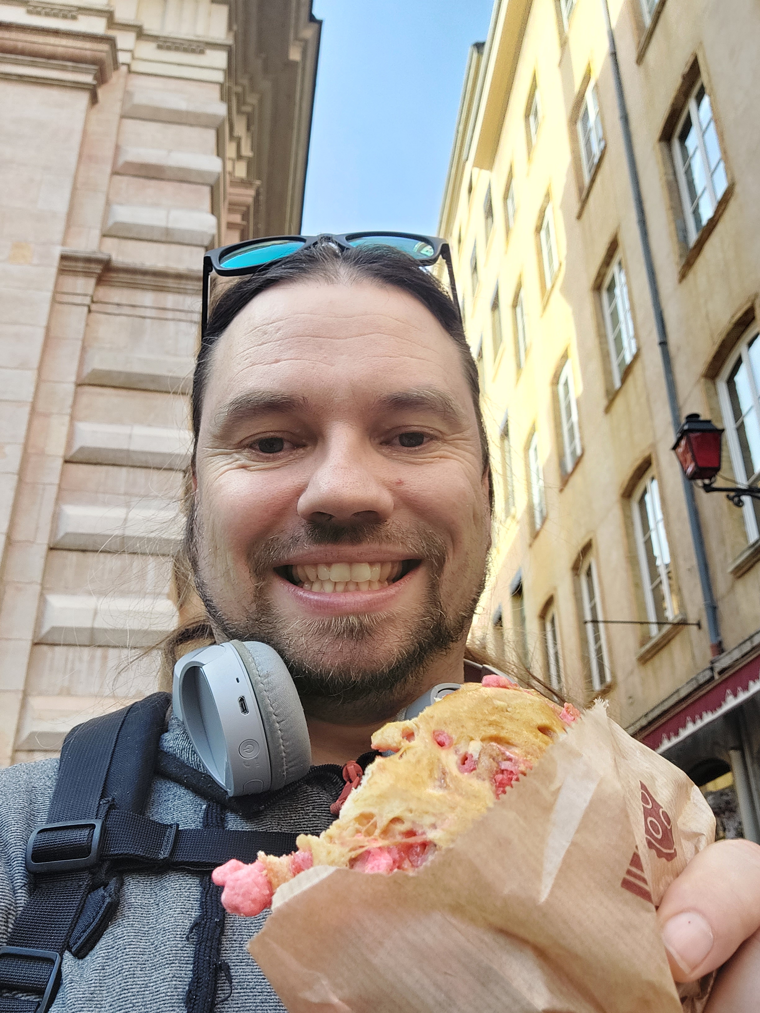 In den Schaufenstern der boulangeries von Lyons sehe ich ganz andere Trümmer: Brioche praline! Hier stehen die Leute Schlange, nur um sich diese zuckrigen Hefebrote zu kaufen. Auch vor einigen Restaurants sind lange Schlangen. Ich erinnere mich, gelesen zu haben, dass Lyon die kulinarische Hauptstadt Frankreichs ist. Ha! Habe ich es doch gewusst, als Kind, als ich mein Brot mit Lyoner mampfte! – Ich kaufe mir in einer Bäckerei ohne Schlange eine brioche praline und verzehre es auf der Straße. Ich habe selten so etwas Süßes gegessen. Einfach nur geil.