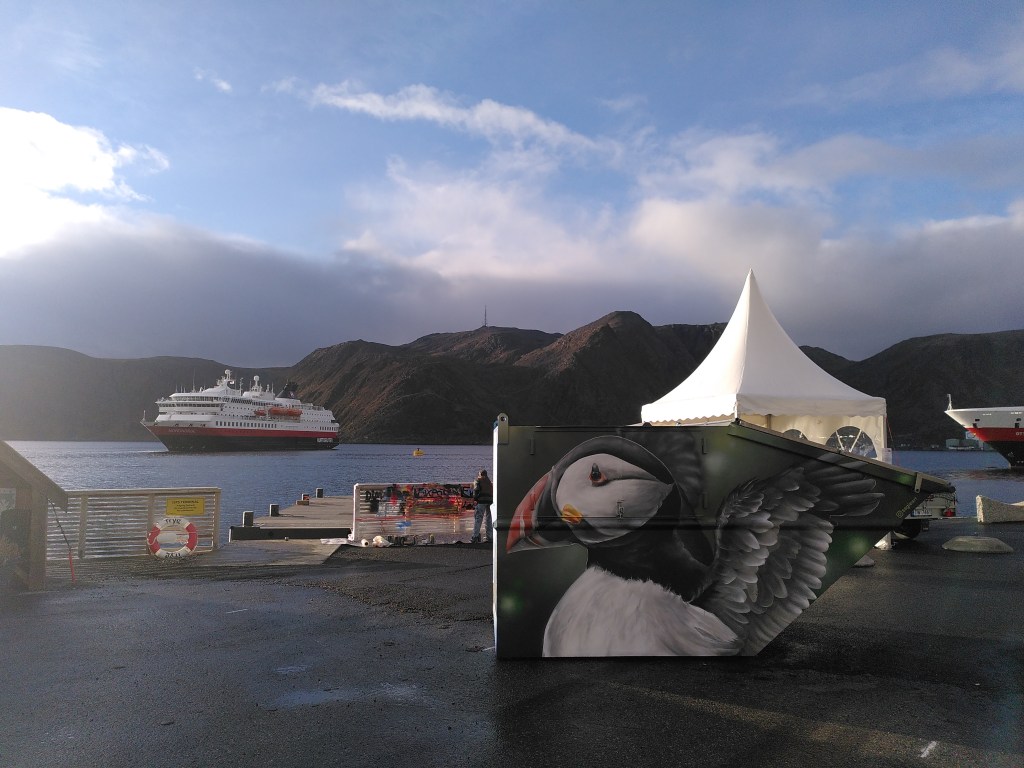 Im Spätsommer (an einem Donnerstag) hatten wir mehrere Sondereinsätze mit Kreuzfahrtschiffen und sind auf die Lofoten und nach Lakselv (Finnmark) gefahren. „Lofotveggen“, also die „Lofoten-Wand“ ragt wirklich eindrucksvoll über dem Meer auf. Es sind 30 Grad im August. Heiße und fettige Touristen. Mmmmh. Der Sommer ging insgesamt so schnell vorbei, dass ich keine scharfen Bilder schießen konnte (s.u.).