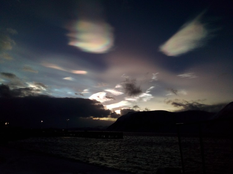 Also brach die Dunkelheit an – doch o Wunder! es ist gar keine Dunkelheit. Jedenfalls nicht die ganze Zeit: Um die Mittagszeit herum gibt es einige Stunden Tageslicht und die schönsten Farben im Himmel, die ich jemals gesehen habe. Zudem gibt es ein Phänomen, das wir unter den Kollegen lieben gelernt haben: die sogenannten „Perlmuttwolken“, das sind Stratosphärenwolken (=ganz hoch), die lustigerweise wohl hauptsächlich aus Säure bestehen. In ihnen brechen sich die Sonnenstrahlen in allen erdenklichen Farben, so dass es aussieht, als hätte jemand regenbogenfarbige Pinselstriche über den Himmel verteilt.